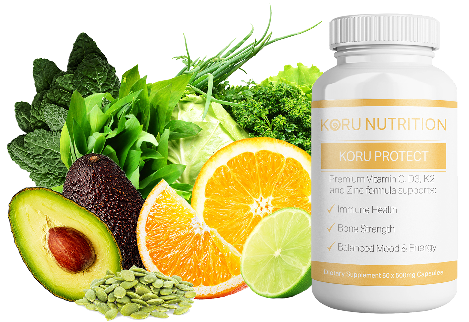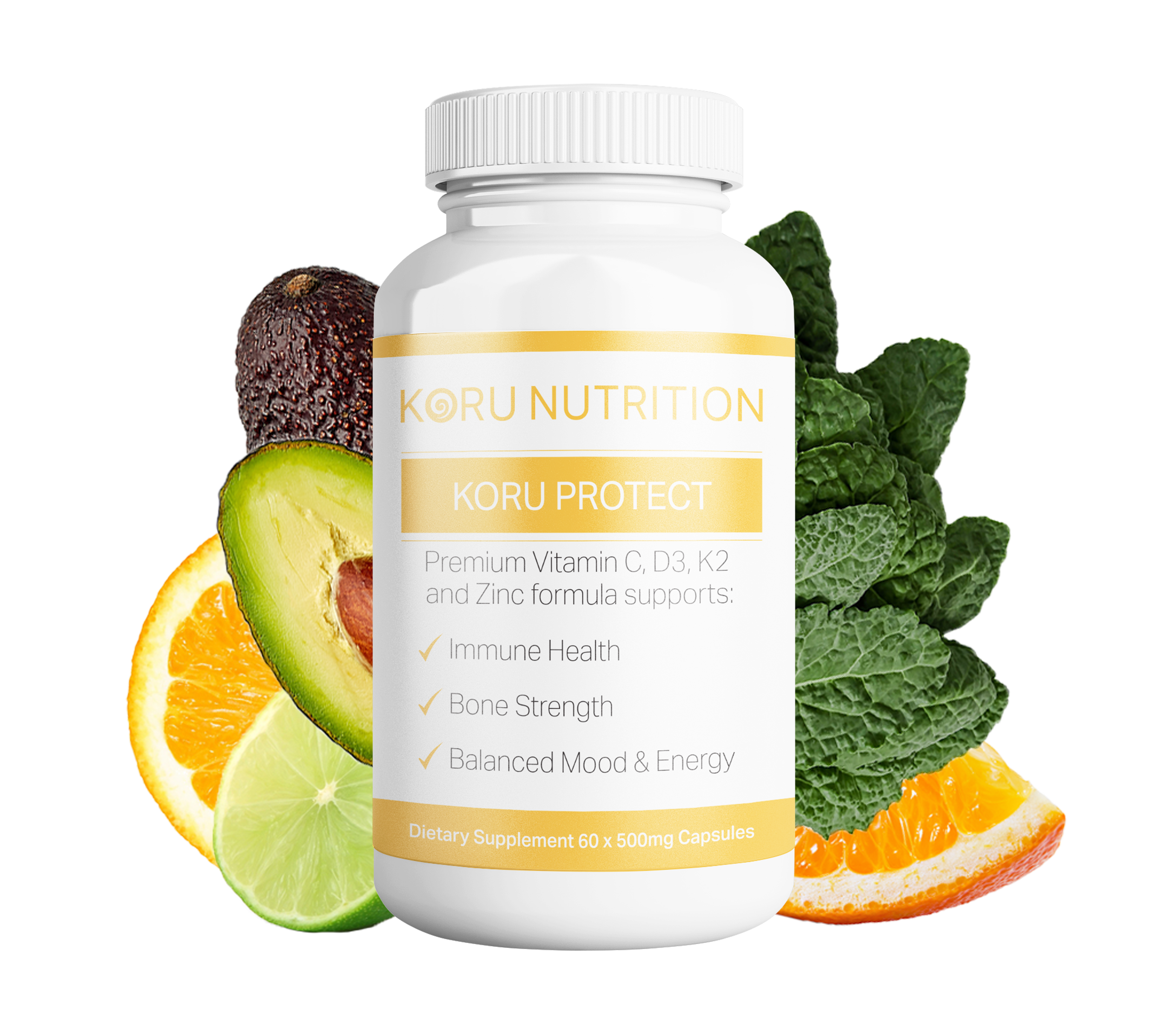 Koru Protect supplies your body with Vitamins C, D3, K2 and Zinc to support your immune system, joints, bones, energy, mood and overall well being.